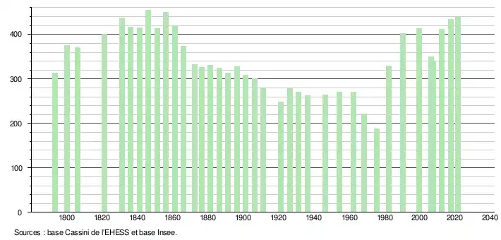 L'évolution du nombre d'habitants est connue à travers les recensements de la population effectués dans la commune depuis 1793. Pour les communes de moins de 10 000 habitants, une enquête de recensement portant sur toute la population est réalisée tous les cinq ans, les populations légales des années intermédiaires étant quant à elles estimées par interpolation ou extrapolation[34]. Pour la commune, le premier recensement exhaustif entrant dans le cadre du nouveau dispositif a été réalisé en 2007[35].