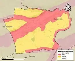 Le retrait-gonflement des sols argileux est susceptible d'engendrer des dommages importants aux bâtiments en cas d’alternance de périodes de sécheresse et de pluie. La totalité de la commune est en aléa moyen ou fort (88,8 % au niveau départemental et 48,5 % au niveau national). Sur les 169 bâtiments dénombrés sur la commune en 2019, 169 sont en aléa moyen ou fort, soit 100 %, à comparer aux 98 % au niveau départemental et 54 % au niveau national. Une cartographie de l'exposition du territoire national au retrait gonflement des sols argileux est disponible sur le site du BRGM[26],[Carte 3].