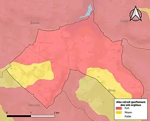Le retrait-gonflement des sols argileux est susceptible d'engendrer des dommages importants aux bâtiments en cas d’alternance de périodes de sécheresse et de pluie. La totalité de la commune est en aléa moyen ou fort (67,4 % au niveau départemental et 48,5 % au niveau national). Sur les 144 bâtiments dénombrés sur la commune en 2019, 144 sont en aléa moyen ou fort, soit 100 %, à comparer aux 84 % au niveau départemental et 54 % au niveau national. Une cartographie de l'exposition du territoire national au retrait gonflement des sols argileux est disponible sur le site du BRGM[23],[Carte 2].