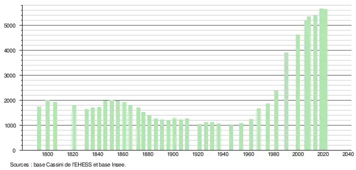 L'évolution du nombre d'habitants est connue à travers les recensements de la population effectués dans la commune depuis 1793. Pour les communes de moins de 10 000 habitants, une enquête de recensement portant sur toute la population est réalisée tous les cinq ans, les populations légales des années intermédiaires étant quant à elles estimées par interpolation ou extrapolation[21]. Pour la commune, le premier recensement exhaustif entrant dans le cadre du nouveau dispositif a été réalisé en 2008[22].