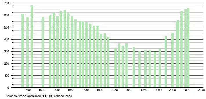 L'évolution du nombre d'habitants est connue à travers les recensements de la population effectués dans la commune depuis 1793. Pour les communes de moins de 10 000 habitants, une enquête de recensement portant sur toute la population est réalisée tous les cinq ans, les populations légales des années intermédiaires étant quant à elles estimées par interpolation ou extrapolation[27]. Pour la commune, le premier recensement exhaustif entrant dans le cadre du nouveau dispositif a été réalisé en 2007[28].