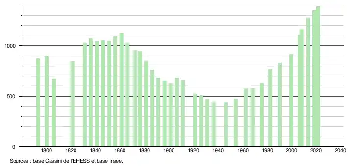 L'évolution du nombre d'habitants est connue à travers les recensements de la population effectués dans la commune depuis 1793. Pour les communes de moins de 10 000 habitants, une enquête de recensement portant sur toute la population est réalisée tous les cinq ans, les populations légales des années intermédiaires étant quant à elles estimées par interpolation ou extrapolation[14]. Pour la commune, le premier recensement exhaustif entrant dans le cadre du nouveau dispositif a été réalisé en 2008[15].