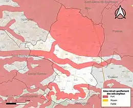Le retrait-gonflement des sols argileux est susceptible d'engendrer des dommages importants aux bâtiments en cas d’alternance de périodes de sécheresse et de pluie. 64,6 % de la superficie communale est en aléa moyen ou fort (54,2 % au niveau départemental et 48,5 % au niveau national). Sur les 380 bâtiments dénombrés sur la commune en 2019, 177 sont en aléa moyen ou fort, soit 47 %, à comparer aux 57 % au niveau départemental et 54 % au niveau national. Une cartographie de l'exposition du territoire national au retrait gonflement des sols argileux est disponible sur le site du BRGM[15],[Carte 2].