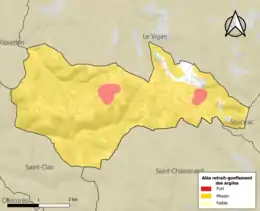 Le retrait-gonflement des sols argileux est susceptible d'engendrer des dommages importants aux bâtiments en cas d’alternance de périodes de sécheresse et de pluie. 95,9 % de la superficie communale est en aléa moyen ou fort (67,7 % au niveau départemental et 48,5 % au niveau national). Sur les 102 bâtiments dénombrés sur la commune en 2019, 101 sont en aléa moyen ou fort, soit 99 %, à comparer aux 72 % au niveau départemental et 54 % au niveau national. Une cartographie de l'exposition du territoire national au retrait gonflement des sols argileux est disponible sur le site du BRGM[24],[Carte 2].