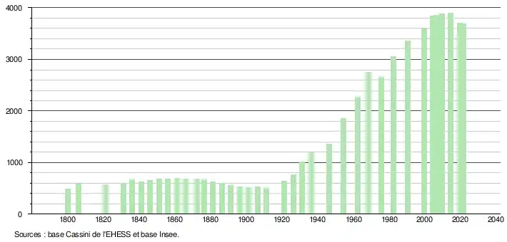 L'évolution du nombre d'habitants est connue à travers les recensements de la population effectués dans la commune depuis 1800. Pour les communes de moins de 10 000 habitants, une enquête de recensement portant sur toute la population est réalisée tous les cinq ans, les populations légales des années intermédiaires étant quant à elles estimées par interpolation ou extrapolation[28]. Pour la commune, le premier recensement exhaustif entrant dans le cadre du nouveau dispositif a été réalisé en 2004[29].
