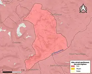 Le retrait-gonflement des sols argileux est susceptible d'engendrer des dommages importants aux bâtiments en cas d’alternance de périodes de sécheresse et de pluie. La totalité de la commune est en aléa moyen ou fort (92 % au niveau départemental et 48,5 % au niveau national). Sur les 134 bâtiments dénombrés sur la commune en 2019, 134 sont en aléa moyen ou fort, soit 100 %, à comparer aux 96 % au niveau départemental et 54 % au niveau national. Une cartographie de l'exposition du territoire national au retrait gonflement des sols argileux est disponible sur le site du BRGM[23],[Carte 3].