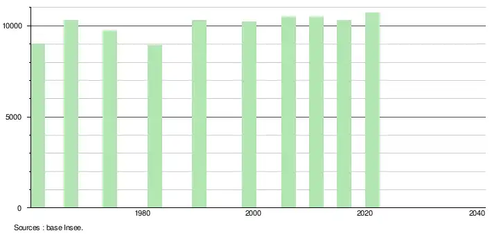 - Par convention dans Wikipédia, le principe a été retenu de n’afficher dans le tableau des recensements et le graphique, pour les populations légales postérieures à 1999, que les populations correspondant à une enquête exhaustive de recensement pour les communes de moins de 10 000 habitants, et que les populations des années 2006, 2011, 2016, etc. pour les communes de plus de 10 000 habitants, ainsi que la dernière population légale publiée par l’Insee pour l'ensemble des communes.