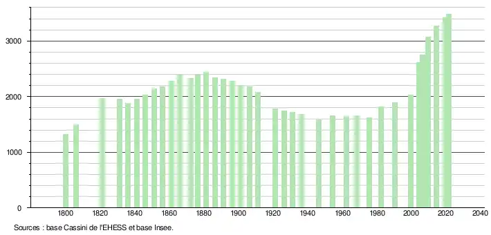 L'évolution du nombre d'habitants est connue à travers les recensements de la population effectués dans la commune depuis 1800. Pour les communes de moins de 10 000 habitants, une enquête de recensement portant sur toute la population est réalisée tous les cinq ans, les populations légales des années intermédiaires étant quant à elles estimées par interpolation ou extrapolation[33]. Pour la commune, le premier recensement exhaustif entrant dans le cadre du nouveau dispositif a été réalisé en 2004[34].