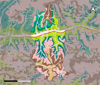 L'occupation des sols de la commune, telle qu'elle ressort de la base de données européenne d’occupation biophysique des sols Corine Land Cover (CLC), est marquée par l'importance des forêts et milieux semi-naturels (51,9 % en 2018), une proportion identique à celle de 1990 (51,9 %). La répartition détaillée en 2018 est la suivante : forêts (49,1 %), zones agricoles hétérogènes (41,2 %), prairies (4,4 %), milieux à végétation arbustive et/ou herbacée (2,8 %), terres arables (2,6 %)[30]. L'évolution de l’occupation des sols de la commune et de ses infrastructures peut être observée sur les différentes représentations cartographiques du territoire : la carte de Cassini (XVIIIe siècle), la carte d'état-major (1820-1866) et les cartes ou photos aériennes de l'IGN pour la période actuelle (1950 à aujourd'hui)[Carte 3].