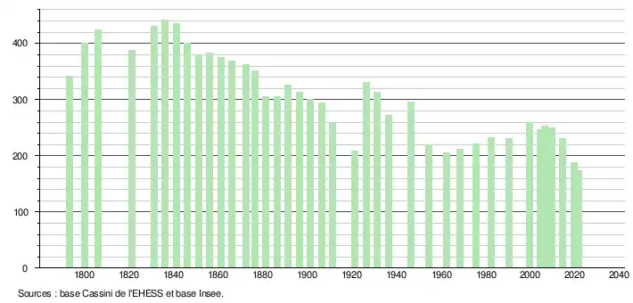 L'évolution du nombre d'habitants est connue à travers les recensements de la population effectués dans la commune depuis 1793. Pour les communes de moins de 10 000 habitants, une enquête de recensement portant sur toute la population est réalisée tous les cinq ans, les populations légales des années intermédiaires étant quant à elles estimées par interpolation ou extrapolation[17]. Pour la commune, le premier recensement exhaustif entrant dans le cadre du nouveau dispositif a été réalisé en 2004[18].
