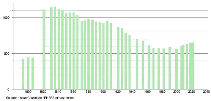 L'évolution du nombre d'habitants est connue à travers les recensements de la population effectués dans la commune depuis 1793. Pour les communes de moins de 10 000 habitants, une enquête de recensement portant sur toute la population est réalisée tous les cinq ans, les populations légales des années intermédiaires étant quant à elles estimées par interpolation ou extrapolation[21]. Pour la commune, le premier recensement exhaustif entrant dans le cadre du nouveau dispositif a été réalisé en 2008[22].