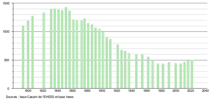 L'évolution du nombre d'habitants est connue à travers les recensements de la population effectués dans la commune depuis 1793. Pour les communes de moins de 10 000 habitants, une enquête de recensement portant sur toute la population est réalisée tous les cinq ans, les populations légales des années intermédiaires étant quant à elles estimées par interpolation ou extrapolation[18]. Pour la commune, le premier recensement exhaustif entrant dans le cadre du nouveau dispositif a été réalisé en 2006[19].