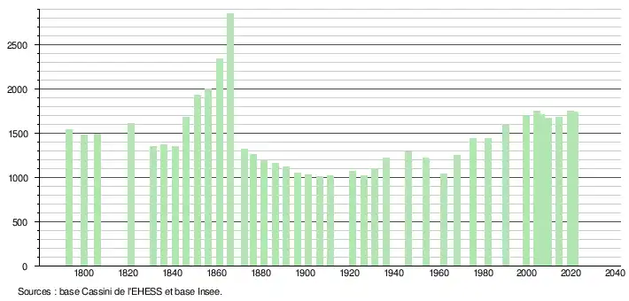 L'évolution du nombre d'habitants est connue à travers les recensements de la population effectués dans la commune depuis 1793. Pour les communes de moins de 10 000 habitants, une enquête de recensement portant sur toute la population est réalisée tous les cinq ans, les populations légales des années intermédiaires étant quant à elles estimées par interpolation ou extrapolation[23]. Pour la commune, le premier recensement exhaustif entrant dans le cadre du nouveau dispositif a été réalisé en 2004[24].
