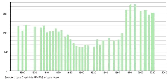 L'évolution du nombre d'habitants est connue à travers les recensements de la population effectués dans la commune depuis 1793. Pour les communes de moins de 10 000 habitants, une enquête de recensement portant sur toute la population est réalisée tous les cinq ans, les populations légales des années intermédiaires étant quant à elles estimées par interpolation ou extrapolation[23]. Pour la commune, le premier recensement exhaustif entrant dans le cadre du nouveau dispositif a été réalisé en 2008[24].