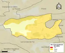 Le retrait-gonflement des sols argileux est susceptible d'engendrer des dommages importants aux bâtiments en cas d’alternance de périodes de sécheresse et de pluie. 75,3 % de la superficie communale est en aléa moyen ou fort (52,8 % au niveau départemental et 48,5 % au niveau national). Sur les 71 bâtiments dénombrés sur la commune en 2019, 65 sont en aléa moyen ou fort, soit 92 %, à comparer aux 70 % au niveau départemental et 54 % au niveau national. Une cartographie de l'exposition du territoire national au retrait gonflement des sols argileux est disponible sur le site du BRGM[16],[Carte 2].