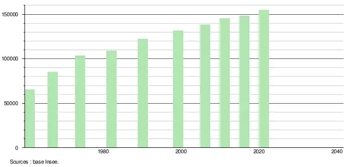 - Par convention dans Wikipédia, le principe a été retenu de n’afficher dans le tableau des recensements et le graphique, pour les populations légales postérieures à 1999, que les populations correspondant à une enquête exhaustive de recensement pour les communes de moins de 10 000 habitants, et que les populations des années 2006, 2011, 2016, etc. pour les communes de plus de 10 000 habitants, ainsi que la dernière population légale publiée par l’Insee pour l'ensemble des communes.
