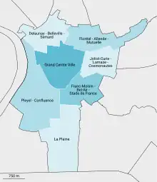 Quartier étendu et "contemporain" quant à ses architectures, assez détaché du reste de Saint-Denis, dont il est, pour une bonne part, séparé par le canal. Il possède par ailleurs son propre code postal (93210 La Plaine Saint-Denis). Ces différentes spécificités et l'histoire du quartier (territoire hérité en partie de l'ancienne commune de La Chapelle) donnent parfois aux habitants du quartier un sentiment d'habiter une ville distincte de Saint-Denis. Sa grande superficie fait que cet ensemble géographique est lui-même divisé en quartiers correspondant aux différentes opérations d'aménagement contemporaines.