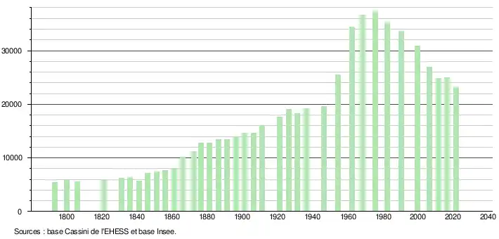 - Par convention dans Wikipédia, le principe a été retenu de n’afficher dans le tableau des recensements et le graphique, pour les populations légales postérieures à 1999, que les populations correspondant à une enquête exhaustive de recensement pour les communes de moins de 10 000 habitants, et que les populations des années 2006, 2011, 2016, etc. pour les communes de plus de 10 000 habitants, ainsi que la dernière population légale publiée par l’Insee pour l'ensemble des communes.