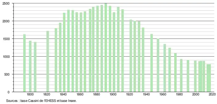 L'évolution du nombre d'habitants est connue à travers les recensements de la population effectués dans la commune depuis 1793. Pour les communes de moins de 10 000 habitants, une enquête de recensement portant sur toute la population est réalisée tous les cinq ans, les populations légales des années intermédiaires étant quant à elles estimées par interpolation ou extrapolation[3]. Pour la commune, le premier recensement exhaustif entrant dans le cadre du nouveau dispositif a été réalisé en 2004[4].