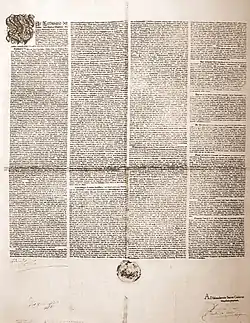 La formule latine sacrum Romanum imperium apparaît sous Frédéric Barberousse. Elle est attestée dès  : sa première occurrence connue  le génitif « sacri romani imperii »  figure dans un diplôme daté du et dont l'original, provenant du fonds de l'église romaine Santa Maria in Via Lata, est conservé à la Bibliothèque apostolique vaticane[36],[37],[N 5]. Pendant l'interrègne de 1250 à 1273, lorsque aucun des trois rois élus n'est parvenu à s'imposer par rapport aux autres, l'Empire se réclame de l'Empire romain avec le qualificatif « saint ». À partir de 1254, on utilise la dénomination latine Sacrum Romanum Imperium (en allemand Heiliges Römisches Reich)[38]. Il faut attendre le règne de Charles IV pour la voir utilisée dans des documents en langue allemande. C'est précisément pendant la période sans empereur au milieu du XIIIe siècle que la volonté d'un pouvoir universel s'est le plus affirmée — même si cette situation a peu changé par la suite.