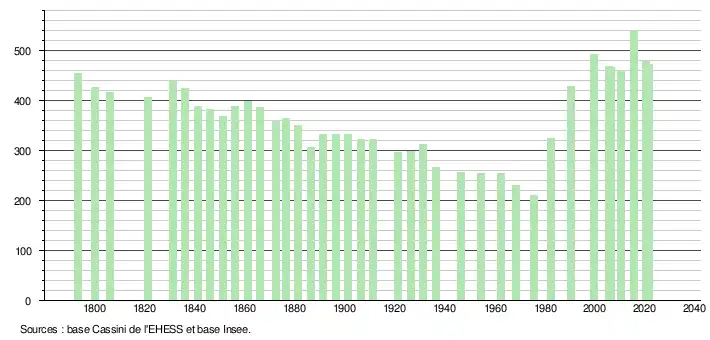 L'évolution du nombre d'habitants est connue à travers les recensements de la population effectués dans la commune depuis 1793. Pour les communes de moins de 10 000 habitants, une enquête de recensement portant sur toute la population est réalisée tous les cinq ans, les populations légales des années intermédiaires étant quant à elles estimées par interpolation ou extrapolation[34]. Pour la commune, le premier recensement exhaustif entrant dans le cadre du nouveau dispositif a été réalisé en 2005[35].