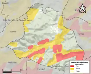 La commune est vulnérable au risque de mouvements de terrains constitué principalement du retrait-gonflement des sols argileux[15]. Cet aléa est susceptible d'engendrer des dommages importants aux bâtiments en cas d’alternance de périodes de sécheresse et de pluie. 41,3 % de la superficie communale est en aléa moyen ou fort (67,5 % au niveau départemental et 48,5 % au niveau national). Sur les 191 bâtiments dénombrés sur la commune en 2019, 100 sont en aléa moyen ou fort, soit 52 %, à comparer aux 90 % au niveau départemental et 54 % au niveau national. Une cartographie de l'exposition du territoire national au retrait gonflement des sols argileux est disponible sur le site du BRGM[16],[Carte 2].