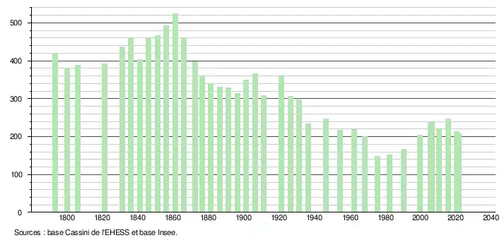 L'évolution du nombre d'habitants est connue à travers les recensements de la population effectués dans la commune depuis 1793. Pour les communes de moins de 10 000 habitants, une enquête de recensement portant sur toute la population est réalisée tous les cinq ans, les populations légales des années intermédiaires étant quant à elles estimées par interpolation ou extrapolation[22]. Pour la commune, le premier recensement exhaustif entrant dans le cadre du nouveau dispositif a été réalisé en 2005[23].