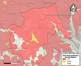 Les mouvements de terrains susceptibles de se produire sur la commune sont des tassements différentiels[35]. Le retrait-gonflement des sols argileux est susceptible d'engendrer des dommages importants aux bâtiments en cas d’alternance de périodes de sécheresse et de pluie[36]. 86,2 % de la superficie communale est en aléa moyen ou fort (58,6 % au niveau départemental et 48,5 % au niveau national métropolitain)[Carte 4]. Depuis le , en application de la loi ÉLAN, différentes contraintes s'imposent aux vendeurs, maîtres d'ouvrages ou constructeurs de biens situés dans une zone classée en aléa moyen ou fort[Note 4],[37].