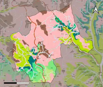 L'occupation des sols de la commune, telle qu'elle ressort de la base de données européenne d’occupation biophysique des sols Corine Land Cover (CLC), est marquée par l'importance des forêts et milieux semi-naturels (63,5 % en 2018), une proportion identique à celle de 1990 (64,1 %). La répartition détaillée en 2018 est la suivante : forêts (62,3 %), zones agricoles hétérogènes (26,6 %), prairies (5,9 %), espaces verts artificialisés, non agricoles (2,5 %), terres arables (1,5 %), milieux à végétation arbustive et/ou herbacée (1,2 %)[29]. L'évolution de l’occupation des sols de la commune et de ses infrastructures peut être observée sur les différentes représentations cartographiques du territoire : la carte de Cassini (XVIIIe siècle), la carte d'état-major (1820-1866) et les cartes ou photos aériennes de l'IGN pour la période actuelle (1950 à aujourd'hui)[Carte 3].