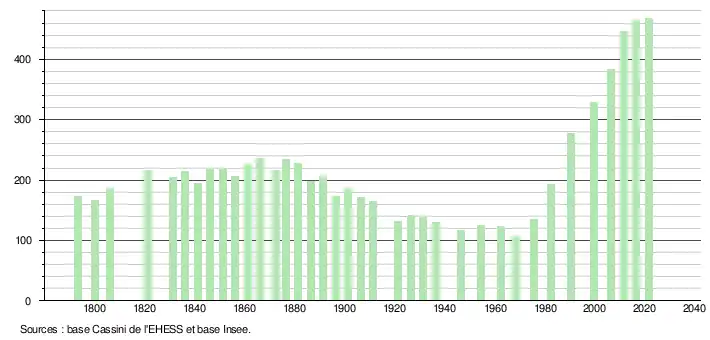 L'évolution du nombre d'habitants est connue à travers les recensements de la population effectués dans la commune depuis 1793. Pour les communes de moins de 10 000 habitants, une enquête de recensement portant sur toute la population est réalisée tous les cinq ans, les populations légales des années intermédiaires étant quant à elles estimées par interpolation ou extrapolation[40]. Pour la commune, le premier recensement exhaustif entrant dans le cadre du nouveau dispositif a été réalisé en 2006[41].