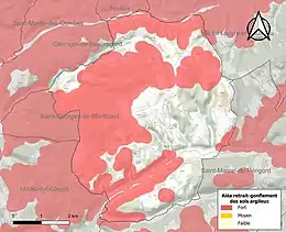 Les mouvements de terrains susceptibles de se produire sur la commune sont des tassements différentiels[41]. Le retrait-gonflement des sols argileux est susceptible d'engendrer des dommages importants aux bâtiments en cas d’alternance de périodes de sécheresse et de pluie[42]. 57 % de la superficie communale est en aléa moyen ou fort (58,6 % au niveau départemental et 48,5 % au niveau national métropolitain)[Carte 2]. Depuis le , en application de la loi ÉLAN, différentes contraintes s'imposent aux vendeurs, maîtres d'ouvrages ou constructeurs de biens situés dans une zone classée en aléa moyen ou fort[Note 4],[43].