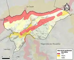 Le retrait-gonflement des sols argileux est susceptible d'engendrer des dommages importants aux bâtiments en cas d’alternance de périodes de sécheresse et de pluie. 36,7 % de la superficie communale est en aléa moyen ou fort (59,3 % au niveau départemental et 48,5 % au niveau national). Sur les 32 bâtiments dénombrés sur la commune en 2019, 10 sont en aléa moyen ou fort, soit 31 %, à comparer aux 85 % au niveau départemental et 54 % au niveau national. Une cartographie de l'exposition du territoire national au retrait gonflement des sols argileux est disponible sur le site du BRGM[22],[Carte 2].