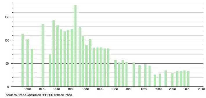 L'évolution du nombre d'habitants est connue à travers les recensements de la population effectués dans la commune depuis 1793. Pour les communes de moins de 10 000 habitants, une enquête de recensement portant sur toute la population est réalisée tous les cinq ans, les populations légales des années intermédiaires étant quant à elles estimées par interpolation ou extrapolation[30]. Pour la commune, le premier recensement exhaustif entrant dans le cadre du nouveau dispositif a été réalisé en 2006[31].