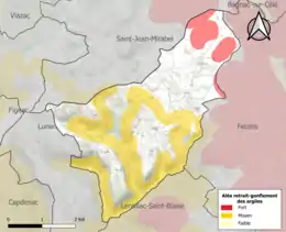 Le retrait-gonflement des sols argileux est susceptible d'engendrer des dommages importants aux bâtiments en cas d’alternance de périodes de sécheresse et de pluie. 45,9 % de la superficie communale est en aléa moyen ou fort (67,7 % au niveau départemental et 48,5 % au niveau national). Sur les 220 bâtiments dénombrés sur la commune en 2019, 71 sont en aléa moyen ou fort, soit 32 %, à comparer aux 72 % au niveau départemental et 54 % au niveau national. Une cartographie de l'exposition du territoire national au retrait gonflement des sols argileux est disponible sur le site du BRGM[19],[Carte 2].