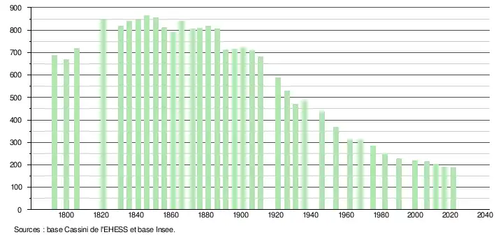 L'évolution du nombre d'habitants est connue à travers les recensements de la population effectués dans la commune depuis 1793. Pour les communes de moins de 10 000 habitants, une enquête de recensement portant sur toute la population est réalisée tous les cinq ans, les populations légales des années intermédiaires étant quant à elles estimées par interpolation ou extrapolation[19]. Pour la commune, le premier recensement exhaustif entrant dans le cadre du nouveau dispositif a été réalisé en 2006[20].