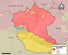 Le retrait-gonflement des sols argileux est susceptible d'engendrer des dommages importants aux bâtiments en cas d’alternance de périodes de sécheresse et de pluie. 97,1 % de la superficie communale est en aléa moyen ou fort (75,2 % au niveau départemental et 48,5 % au niveau national). Sur les 108 bâtiments dénombrés sur la commune en 2019, 108 sont en aléa moyen ou fort, soit 100 %, à comparer aux 94 % au niveau départemental et 54 % au niveau national. Une cartographie de l'exposition du territoire national au retrait gonflement des sols argileux est disponible sur le site du BRGM[21],[Carte 3].