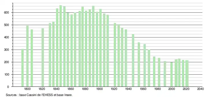 L'évolution du nombre d'habitants est connue à travers les recensements de la population effectués dans la commune depuis 1793. Pour les communes de moins de 10 000 habitants, une enquête de recensement portant sur toute la population est réalisée tous les cinq ans, les populations légales des années intermédiaires étant quant à elles estimées par interpolation ou extrapolation[20]. Pour la commune, le premier recensement exhaustif entrant dans le cadre du nouveau dispositif a été réalisé en 2005[21].