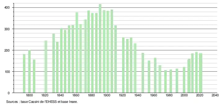 L'évolution du nombre d'habitants est connue à travers les recensements de la population effectués dans la commune depuis 1793. Pour les communes de moins de 10 000 habitants, une enquête de recensement portant sur toute la population est réalisée tous les cinq ans, les populations légales des années intermédiaires étant quant à elles estimées par interpolation ou extrapolation[24]. Pour la commune, le premier recensement exhaustif entrant dans le cadre du nouveau dispositif a été réalisé en 2005[25].