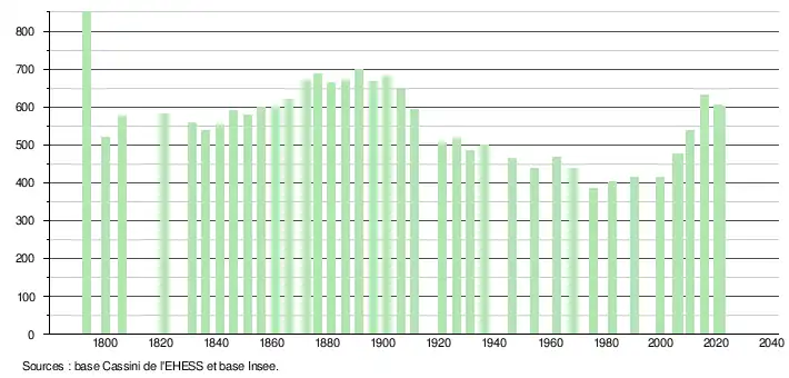L'évolution du nombre d'habitants est connue à travers les recensements de la population effectués dans la commune depuis 1793. Pour les communes de moins de 10 000 habitants, une enquête de recensement portant sur toute la population est réalisée tous les cinq ans, les populations légales des années intermédiaires étant quant à elles estimées par interpolation ou extrapolation[15]. Pour la commune, le premier recensement exhaustif entrant dans le cadre du nouveau dispositif a été réalisé en 2005[16].