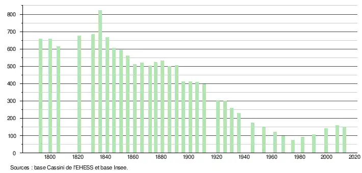 - Par convention dans Wikipédia, le principe a été retenu de n’afficher dans le tableau des recensements et le graphique, pour les populations légales postérieures à 1999, que les populations correspondant à une enquête exhaustive de recensement pour les communes de moins de 10 000 habitants, et que les populations des années 2006, 2011, 2016, etc. pour les communes de plus de 10 000 habitants, ainsi que la dernière population légale publiée par l’Insee pour l'ensemble des communes.