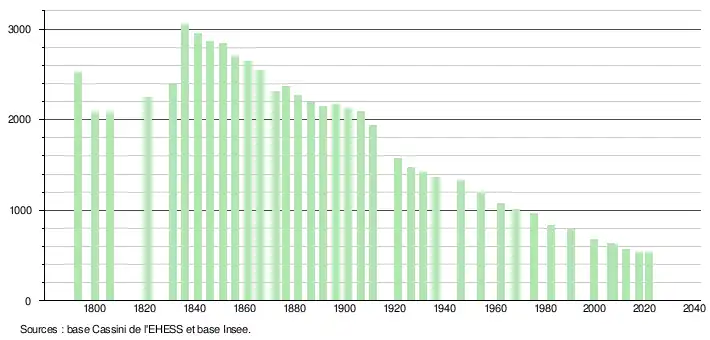 L'évolution du nombre d'habitants est connue à travers les recensements de la population effectués dans la commune depuis 1793. Pour les communes de moins de 10 000 habitants, une enquête de recensement portant sur toute la population est réalisée tous les cinq ans, les populations légales des années intermédiaires étant quant à elles estimées par interpolation ou extrapolation[26]. Pour la commune, le premier recensement exhaustif entrant dans le cadre du nouveau dispositif a été réalisé en 2007[27].