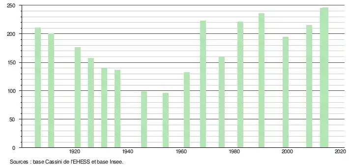 - Par convention dans Wikipédia, le principe a été retenu de n’afficher dans le tableau des recensements et le graphique, pour les populations légales postérieures à 1999, que les populations correspondant à une enquête exhaustive de recensement pour les communes de moins de 10 000 habitants, et que les populations des années 2006, 2011, 2016, etc. pour les communes de plus de 10 000 habitants, ainsi que la dernière population légale publiée par l’Insee pour l'ensemble des communes.