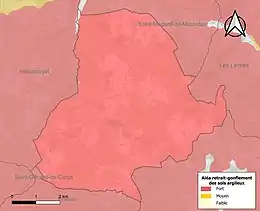 Les mouvements de terrains susceptibles de se produire sur la commune sont des tassements différentiels[42]. Le retrait-gonflement des sols argileux est susceptible d'engendrer des dommages importants aux bâtiments en cas d’alternance de périodes de sécheresse et de pluie[43]. 99,9 % de la superficie communale est en aléa moyen ou fort (58,6 % au niveau départemental et 48,5 % au niveau national métropolitain)[Carte 4]. Depuis le , en application de la loi ÉLAN, différentes contraintes s'imposent aux vendeurs, maîtres d'ouvrages ou constructeurs de biens situés dans une zone classée en aléa moyen ou fort[Note 4],[44].
