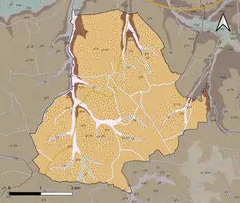 L'occupation des sols de la commune, telle qu'elle ressort de la base de données européenne d’occupation biophysique des sols Corine Land Cover (CLC), est marquée par l'importance des forêts et milieux semi-naturels (68,2 % en 2018), une proportion identique à celle de 1990 (67,8 %). La répartition détaillée en 2018 est la suivante : forêts (65,6 %), zones agricoles hétérogènes (23 %), prairies (8,8 %), milieux à végétation arbustive et/ou herbacée (2,6 %)[36]. L'évolution de l’occupation des sols de la commune et de ses infrastructures peut être observée sur les différentes représentations cartographiques du territoire : la carte de Cassini (XVIIIe siècle), la carte d'état-major (1820-1866) et les cartes ou photos aériennes de l'IGN pour la période actuelle (1950 à aujourd'hui)[Carte 3].