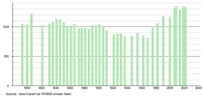 L'évolution du nombre d'habitants est connue à travers les recensements de la population effectués dans la commune depuis 1793. Pour les communes de moins de 10 000 habitants, une enquête de recensement portant sur toute la population est réalisée tous les cinq ans, les populations légales des années intermédiaires étant quant à elles estimées par interpolation ou extrapolation[25]. Pour la commune, le premier recensement exhaustif entrant dans le cadre du nouveau dispositif a été réalisé en 2008[26].
