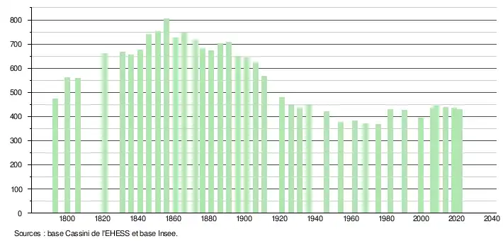 L'évolution du nombre d'habitants est connue à travers les recensements de la population effectués dans la commune depuis 1793. Pour les communes de moins de 10 000 habitants, une enquête de recensement portant sur toute la population est réalisée tous les cinq ans, les populations légales des années intermédiaires étant quant à elles estimées par interpolation ou extrapolation[24]. Pour la commune, le premier recensement exhaustif entrant dans le cadre du nouveau dispositif a été réalisé en 2008[25].