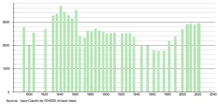 L'évolution du nombre d'habitants est connue à travers les recensements de la population effectués dans la commune depuis 1793. Pour les communes de moins de 10 000 habitants, une enquête de recensement portant sur toute la population est réalisée tous les cinq ans, les populations légales des années intermédiaires étant quant à elles estimées par interpolation ou extrapolation[16]. Pour la commune, le premier recensement exhaustif entrant dans le cadre du nouveau dispositif a été réalisé en 2005[17].