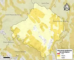 Le retrait-gonflement des sols argileux est susceptible d'engendrer des dommages importants aux bâtiments en cas d’alternance de périodes de sécheresse et de pluie[17]. 44,7 % de la superficie communale est en aléa moyen ou fort (27 % au niveau départemental et 48,5 % au niveau national métropolitain)[Carte 2]. Depuis le , en application de la loi ÉLAN, différentes contraintes s'imposent aux vendeurs, maîtres d'ouvrages ou constructeurs de biens situés dans une zone classée en aléa moyen ou fort[Note 3],[18].