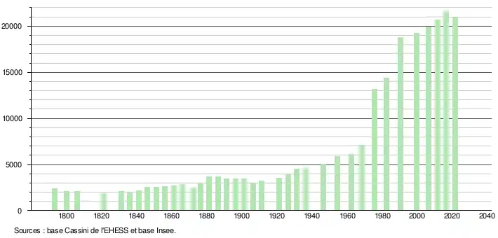 - Par convention dans Wikipédia, le principe a été retenu de n’afficher dans le tableau des recensements et le graphique, pour les populations légales postérieures à 1999, que les populations correspondant à une enquête exhaustive de recensement pour les communes de moins de 10 000 habitants, et que les populations des années 2006, 2011, 2016, etc. pour les communes de plus de 10 000 habitants, ainsi que la dernière population légale publiée par l’Insee pour l'ensemble des communes.