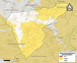 Le retrait-gonflement des sols argileux est susceptible d'engendrer des dommages importants aux bâtiments en cas d’alternance de périodes de sécheresse et de pluie. 69,4 % de la superficie communale est en aléa moyen ou fort (67,4 % au niveau départemental et 48,5 % au niveau national). Sur les 439 bâtiments dénombrés sur la commune en 2019, 402 sont en aléa moyen ou fort, soit 92 %, à comparer aux 81 % au niveau départemental et 54 % au niveau national. Une cartographie de l'exposition du territoire national au retrait gonflement des sols argileux est disponible sur le site du BRGM[20],[Carte 3].